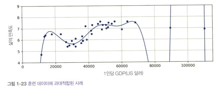 - 삶의 만족도에 대한 선형 모델 : 현실은 이 모델보다 더 복잡하므로 훈련 샘플에서조차도 부정확한 예측을 만들 것이다.