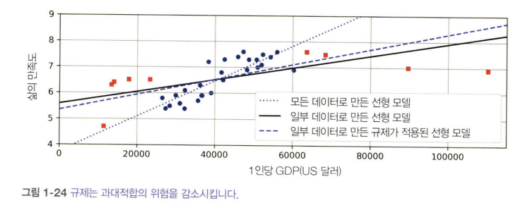 - 실선 모델: 첫 번째 모델과 같은 데이터에 규제를 적용한 선형 모델