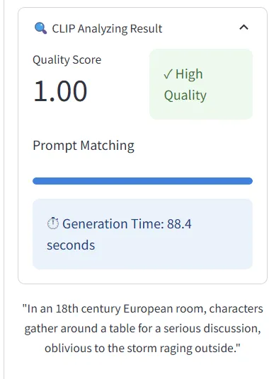 품질 점수는 1.00으로, 이는 가능한 가장 높은 CLIP 유사도 점수를 나타낸다. 시스템은 이 점수를 기반으로 콘텐츠를 “고품질”로 분류했으며, 이는 코드에서 설정한 임계값(아마도 0.7 이상)을 충족했기 때문이다.