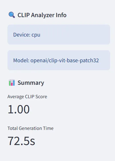 - Average CLIP Score: 1.00 - 생성된 모든 이미지의 평균 CLIP 점수. 1.00은 최대 점수로, 텍스트 프롬프트와 생성된 이미지 간의 의미적 일치도가 완벽하다는 걸 의미.