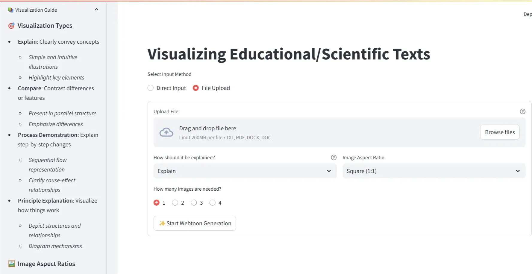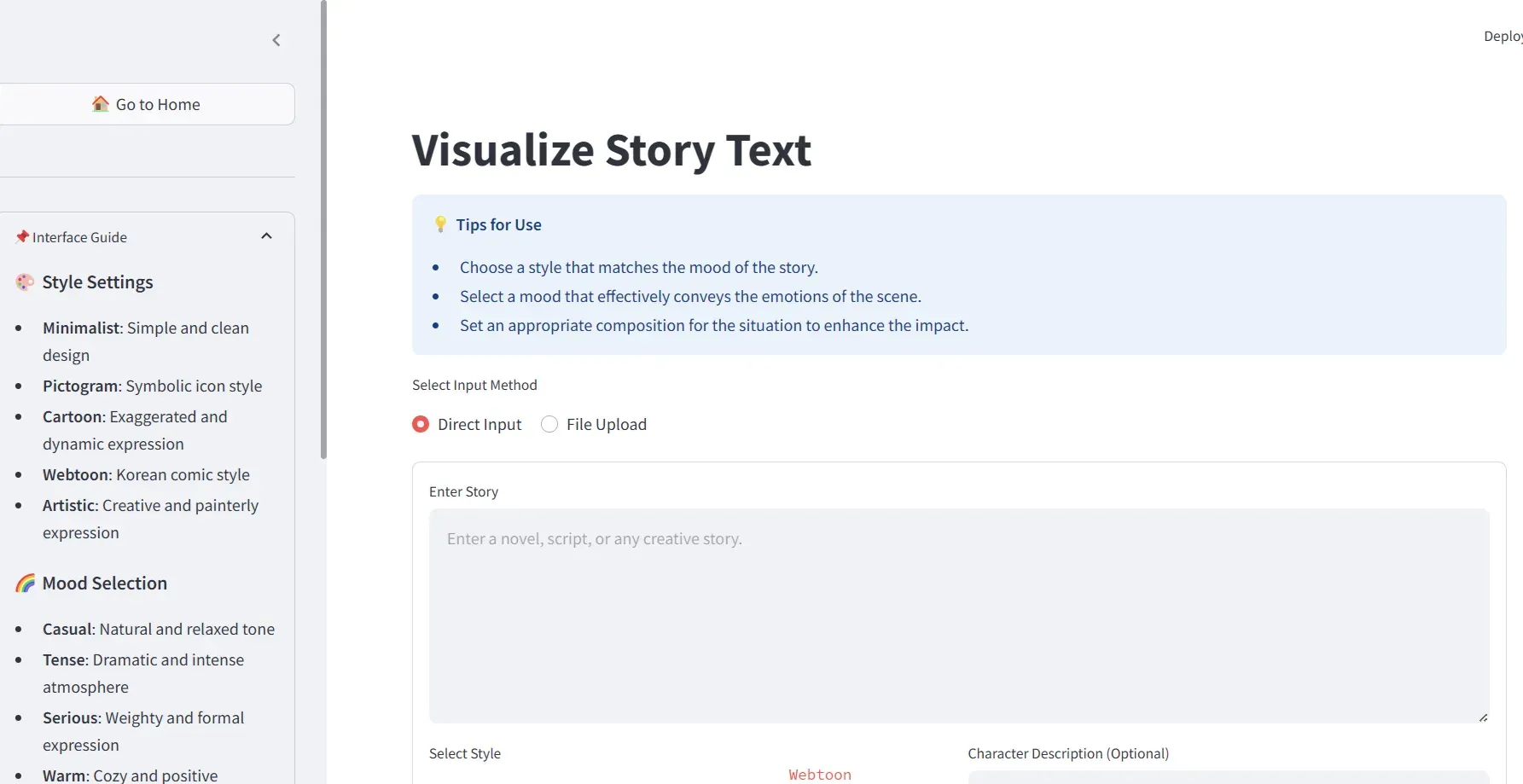 - “Visualize Story Text” (스토리 텍스트 시각화) - 소설, 스크립트, 이야기 등을 웹툰 형식으로 변환하는 옵션. 이 옵션은 주로 서사적인 텍스트를 다룰 때 사용하며, 캐릭터와 스토리 흐름을 시각화하는 데 최적화
