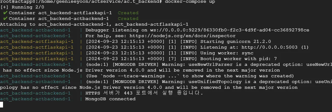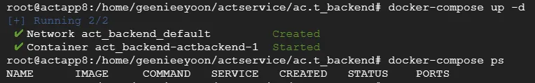 - 성공적으로 컨테이너가 생성됐다. (act_backend-actflaskapi-1와 act_backend-actbackend-1)